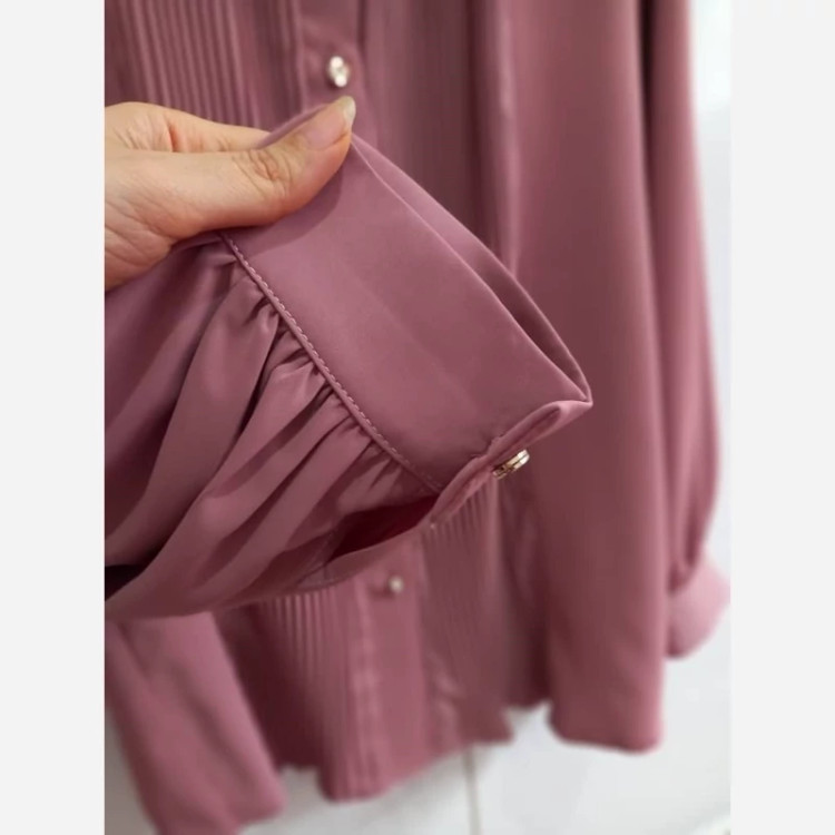 شومیز مجلسی زنانه جنس پارچه : کرپ الیزه رنگ : کالباسی مناسب مجالس و دورهمی ها و قابل ست کردن با انواع شلوار و دامن های کوتاه مدل جلوباز است یعنی دکمه های شومیز قابل بازشدن میباشد سایز 2 مناسب 42 و 44 دورسینه : 114 دورباسن : 126 دوربازو : 40 دور مچ 22 قد آستین : 60 قد شومیز : 70